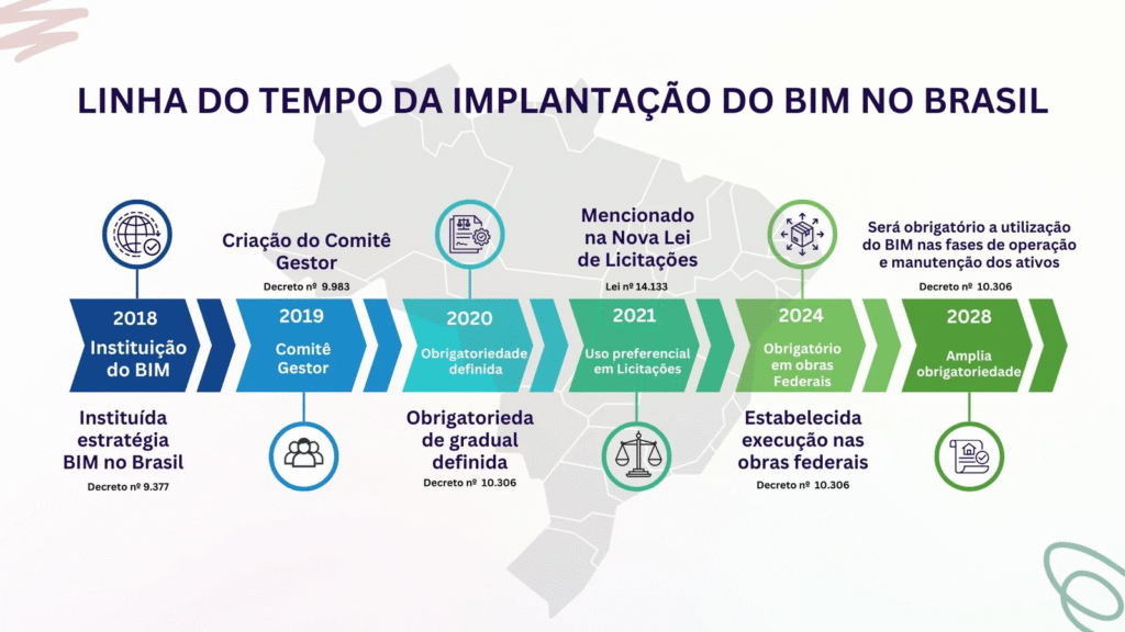 Do ponto de vista legal, o Brasil já formalizou exigências para adoção do BIM em obras públicas. O Decreto Federal nº 10.306/2020 institui o uso gradual da metodologia por órgãos da administração pública federal. Desde janeiro de 2024, o BIM passou a ser exigido na execução direta ou indireta de projetos de engenharia e arquitetura e no gerenciamento de obras, devendo alcançar também a fase de manutenção e operação dos empreendimentos até 2028.